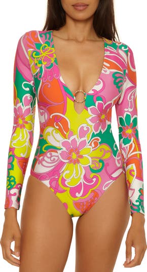 A golden ring highlights the plunge neck of a colorful one-piece swimsuit, framed by long sleeves.