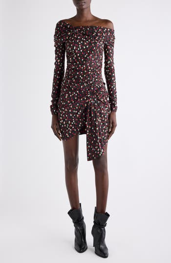 Blurry polka dots bring a playful attitude to this gracefully ruched and gathered stretch silk dress finished with a drape detail that adds swingy movement with your every step.