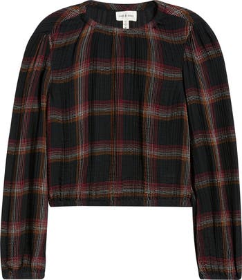 Gathers at the neckline and hem give this dusky-hued plaid top its soft fit and easy-going personality.