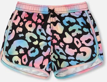 The swim shorts in black with leopard print bring a bold and playful twist to beach days. Designed with a colorful leopard pattern over a black background, these bottoms feature an elastic waistband with an adjustable drawstring for a secure fit. A curved hem adds comfort and style, while recycled polyester with a soft lining completes the “Like A Fish To Water” collection with energy and flair.