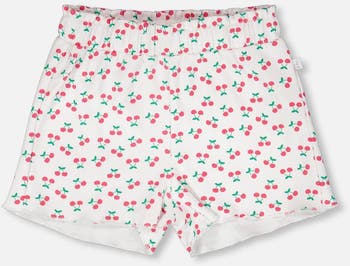 These rib shorts in white with printed cherries add a fun retro vibe to her warm-weather looks. These bottoms feature an allover cherry print with a ribbed texture, an elastic waist, and scalloped hems for a delicate finish. Made from soft cotton with added stretch, they ensure comfort and playful style all season long in our “Cherry On The Check” collection.