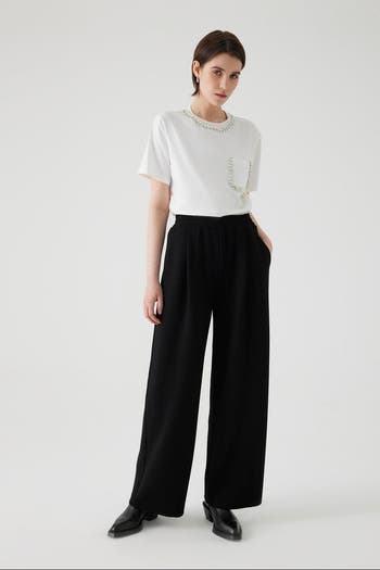 The Elastic Waist Wide Leg Pants in black combines a wide-leg silhouette. It stays comfortable through the day and works easily across casual and polished looks. It styles easily with shirts, knits, or simple tops for both casual and polished dressing.