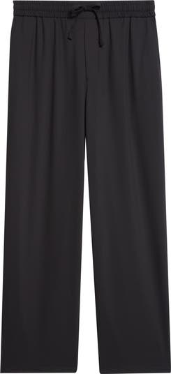 Smooth wool gabardine takes a casual turn in these straight-leg pants constructed with an elasticized drawstring waist and patch pockets in back.