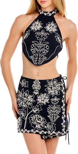 An eye-catching embroidery pops against the dark background of this cover-up crop top fashioned from breathable cotton with a hint of stretch to keep you moving.