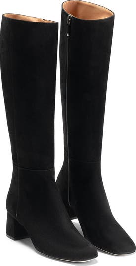 A mid-height block heel adds subtle elevation to a streamlined leather boot shaped in a knee-high profile and secured with a full-length side zipper.