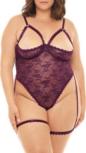 Stunning lace and attached garter straps lend flirty charm to this open-cup underwire teddy that was meant to be seen.