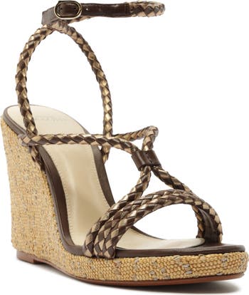Glinting metallic threads highlight the lofty raffia-wrapped wedge heel of this stunning ankle-strap sandal caged in braided-leather corded straps.