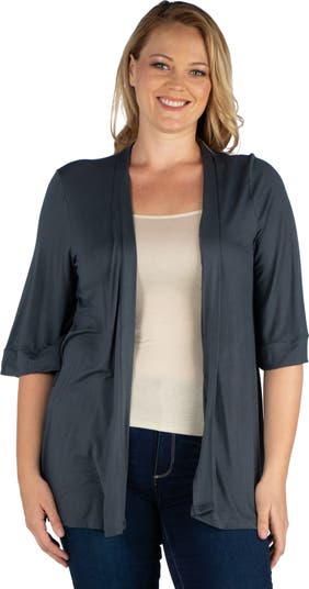 An easy add on to any look, this elbow length sleeve plus size cardigan for women is a great wardrobe staple. Featuring loose fit elbow length sleeves, open front design, and extend length, and a comfortable relaxed fit. Simply throw this cardigan on over a tshirt and jeans look for an added touch of style. Available in eight classic colors and made from a comfortable stretch material that is machine washable.