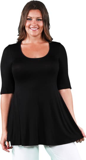 This stylish solid colored plus size tunic top features a feminine print and a figure flattering design. The elbow length sleeves, scoop neckline, and swing top shape make it a go to tunic top in any closet. Perfect short sleeve tunic tops for leggings. Made from a comfortable stretch material. rayon spandex blend