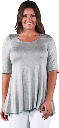 This stylish solid colored plus size tunic top features a feminine print and a figure flattering design. The elbow length sleeves, scoop neckline, and swing top shape make it a go to tunic top in any closet. Perfect short sleeve tunic tops for leggings. Made from a comfortable stretch material. rayon spandex blend