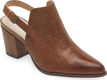 A pointy toe and wrapped block heel balance a burnished leather mule fashioned with an adjustable slingback strap for a secure fit.