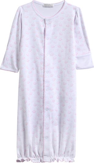 Roly-poly elephants enhance the charm of a pima-cotton gown that easily converts to a play-ready romper with snaps between the legs. Fold-over cuffs help prevent accidental scratches.