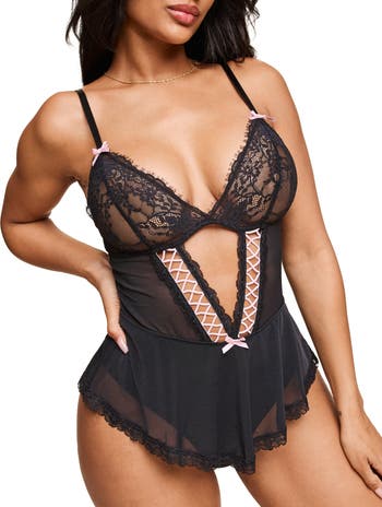The Eleanor bodysuit is a piece made of sheer fabric. It features unlined triangle cups, a mesh peplum skirt, and fully adjustable straps.