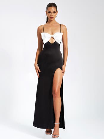 Wow in our Eleanor black and white bow dress! This gown features a captivating large bow at the center chest, a chic cutout and a high leg slit creating a modern and sophisticated silhouette. The dipped ‘V’ back adds an extra element of allure to this already show-stopping piece. Crafted from luxury double duchess satin and lined for comfort in satin, this gown feels as luxurious as it looks. The thin satin spaghetti straps with adjusters at the back provide a customizable fit, ensuring you feel confident in every step. The invisible zipper at the center back allows for easy wear. Eleanor is perfect for a range of celebratory occasions big or small. Choose between the black and white combo for a classic look, or opt for the all-red mini version, the Xyla Red Satin Bow Mini Dress, for a bold and playful statement. Materials: Double Duchess Luxe Satin Length from underarm: Approx 49.6 inch / 126 cm Stretch Factor: Non Stretch Clean: Dry-clean only Model Is Wearing A Size XS (US-2) Model Is 5'11" Color may vary due to lighting on images. The product images (without model) are the closest to the true color of the product