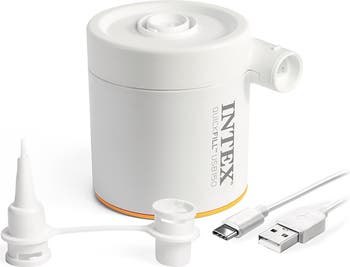 INTEX: QUICKFILL: USB150 AIR PUMP - The INTEX® QuickFill USB Mini Pump is the ultimate portable solution for quick and hassle-free inflation on the go. Its compact design fits in the palm of your hand, making it ideal for inflating pool floats, camping mats, and more. Powered by a variety of USB-compatible power sources, this sleek air pump ensures convenience wherever you are. Equipped with a USB-A-to-USB-C power cord (USB-A cube not included), this mini pump is compatible with 5V USB power sources rated at 2 amps or higher. Its powerful performance delivers a maximum air flow of 150 L/minute and pressure of 0.43 psi, ensuring effortless inflation and deflation in just minutes. For added convenience, the QuickFill USB150 comes with an 8.5 ft power cord and a carry bag, making it easy to store and transport. Whether you're heading to the pool or out on a camping trip, this mini pump is the perfect companion for all your inflatable needs. The INTEX QuickFill USB150 Air Pump combines efficiency, portability, and ease of use—making it a must-have for outdoor adventures and everyday convenience. KEY FEATURES OVERVIEW: 1) Portable and compact design—fits in the palm of your hand. 2) Compatible with 5V USB power sources (2 amps or higher). 3) Includes 8.5 ft USB-C to USB-A power cord. 4) Maximum air flow: 150 L/minute; pressure: 0.43 psi. 5) Convenient carry bag for easy storage and travel.