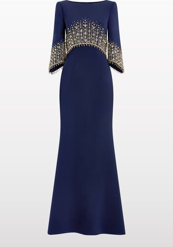 This evening gown is defined by its clean, structured silhouette and striking embellishment that frames the waist and sleeves. The bateau neckline and flared three-quarter sleeves add an elegant architectural element, while the floor-length design enhances the gowns refined simplicity. Beaded detailing introduces texture and light-catching movement, creating a focal point that elevates the minimalist shape. Perfect for black-tie occasions, gala dinners, or formal receptions, this gown offers a modern yet timeless statement.