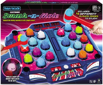 Bring the thrills and excitement of the Arcade right into your own home! The smash-a-mole game is an all-time arcade favorite. This home use version offers all the fun of the arcade one, but with even more playing functions and features to enjoy! The large playing board features 10 colorful moles per side, each with a funny facial expression. As the moles light up quickly smash them with your mallet to score! There are 4 different playing modes to keep you entertained. First play in single player mode using 1 side of the board, and advance through the levels by hitting enough moles before the time expires. Once you've succeeded you may shift to 'master' mode, smashing moles on both sides of the board! Then challenge a friend to head-to-head competition in which each of you hits the moles on 1 side of the board, trying to accumulate as many points as possible in 60 seconds to win. Finally, play the mole memory game where you need to hit the moles in the same sequence as they light up! Features music, sound effects, and a large LED scoreboard. Requires 4 x AA batteries (not included). Recommended for ages 6 and over.