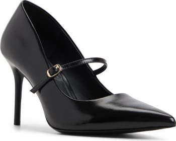 A pointy toe elongates the profile of a sleek leather pump lifted by a stiletto heel and secured with an adjustable mary jane strap. A dual-density foam footbed provides lasting comfort.