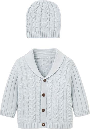Baby will feel comfy and look adorable in this classic cable-knit cotton set featuring a button-front cardigan and a matching hat.