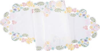 - This 100% polyester table runner features an egg-shaped silhouette with a scalloped cutwork border embroidered with Easter eggs, daisies, and fern sprigs in soft pink, yellow, teal, lavender, and green, creating an elegant seasonal accent.