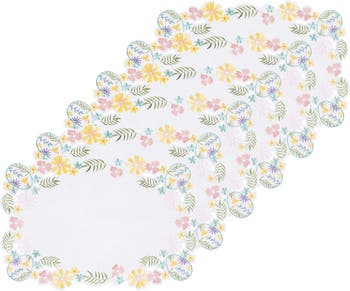 - This charming set of 6 placemats features an elegant oval egg shape with beautiful cutwork scalloped edges adorned with embroidered spring flowers in sunny yellow, coral pink, soft aqua, and lavender, accented by green fern fronds and decorative Easter eggs on crisp white fabric.