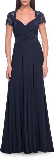Elegant evening gown with a full jersey skirt and ruching detail on the bodice. The top, sleeves, and back feature lace details. Back zipper closure.