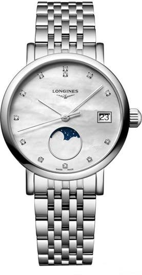A mother-of-pearl dial marked with diamond indexes and a starry moonphase function accentuates the clean elegance of this precision Swiss-quartz timepiece fitted with a polished stainless steel bracelet.
