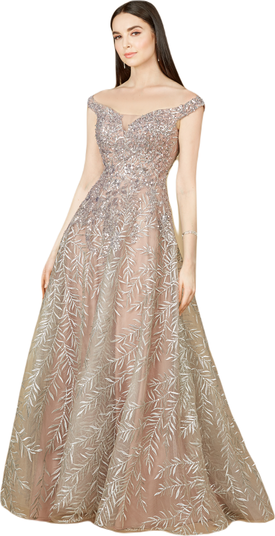 Gorgeous off shoulder, A-line ball gown with a full embroidered and beaded skirt. Features an elegant leaf pattern with two tone lining to give this gown a more dimensional look. The perfect dress to wear to your bridal party or another formal event