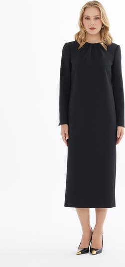 This midi dress features slit sleeves and subtle metal detailing for contemporary elegance. Occasion: Evening dinners, formal gatherings, business events, and smart casual styling.