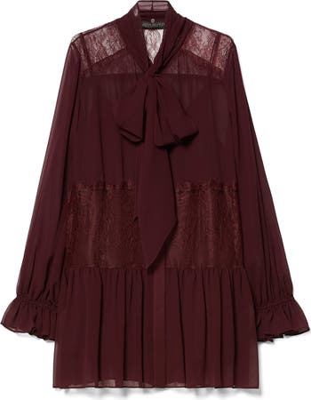 A Victorian romantic revival style, this flowing, ruffle-hem tunic features a camisole lining and an optional neck tie that coordinate with the georgette top inset with delicate lace panels.