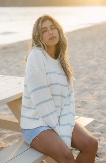 A nod to the nautical fanatics! This chunky long sleeve sweater can truly be worn day or night, summer or fall, and with just about anything. Style with your favorite trendy barrel jeans and sandals for the ultimate E+I look.