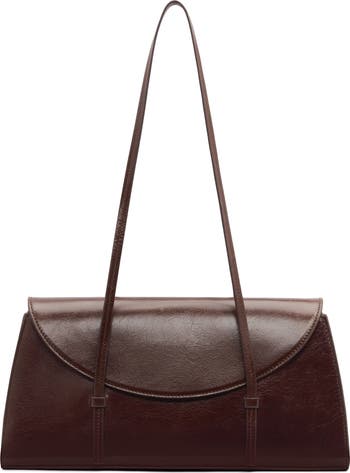 Clean lines and a slim East/West profile distinguish a structured leather shoulder bag suspended from elongated straps for comfortable wear.
