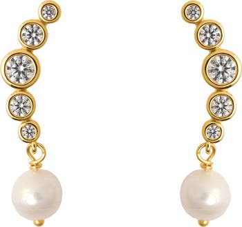 Curved-bar earrings formed from bezel-set cubic zirconia have a classic-meets-contemporary allure with freshwater pearl anchors.
