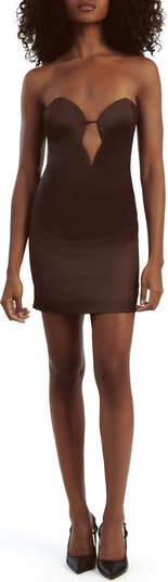 An event-ready strapless minidress is cut from silky satin cast in a chocolate-brown shade and designed with a daring plunge neckline for an ultrasassy look.