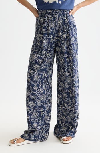 Traced in ivory blooms, these flowy wide-leg pants sport contrast piping down the sides and an easy elastic waist.