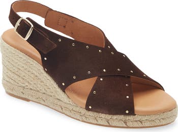 Polished microstuds trims the crisscrossing suede straps on an espadrille-inspired sandal lifted by a subtle platform and jute-wrapped wedge heel.