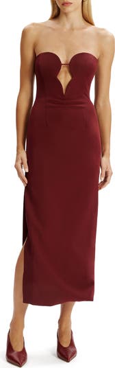 An event-ready strapless midi cast in a deep red shade features a daring plunge neckline for an ultrasassy look.