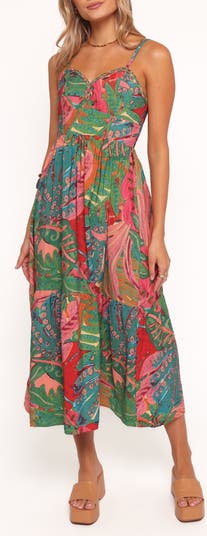Braided trim traces the sweetheart neckline of a beautiful fit-and-flare dress featuring an artistic, brightly colored print.