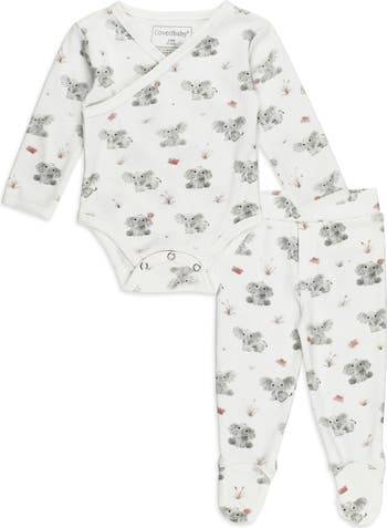 A playful print brings adorable charm to an organic-cotton bodysuit detailed with a convenient wrap front and paired with matching pants in a comfy set that will keep your little one cozy.