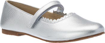 A scalloped instep and adjustable strap add kid-friendly charm to an adorable mary jane set on a cushioned footbed and durable rubber sole.