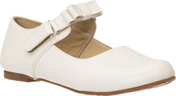 A charming bow tops this cushioned mary jane that's easy for her to get on with an adjustable hook-and-loop strap.