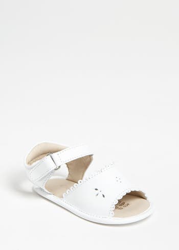 Sweet scalloped trim dances along a creamy leather sandal with lining designed to absorb moisture and keep your tiny one's toes dry and comfy.