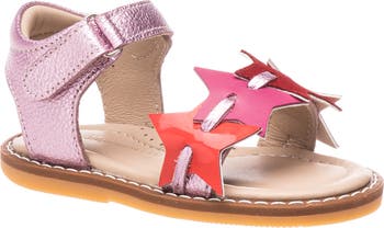 A vibrant lineup of stars brings bold colors and textures to this breezy sandal with a metallic ankle strap to add an extra sparkle to your kiddo's step.