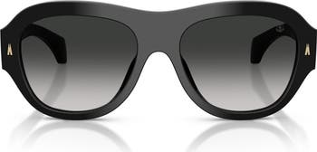 Signature logos accent the frames and temples of Italian-made sunglasses shaped in an irregular profile and fitted with UV-protective lenses.