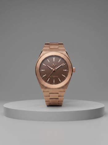 - Swiss Ronda 763 quartz movement Case size: 42mm Stainless steel case and bracelet Sapphire-coated crystal Water resistance: 5 ATM Dial color: Muted Rose Gold/Mocha Bracelet finish: Brushed Rose Gold Deployant clasp Limited production Manufacturer’s 60-month warranty
