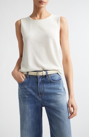 Knit in Italy from a luxurious silk-and-cotton yarn, this sweater-vest has a breezy finish that’s made for warmer days and bright nights. Scattered sequins add a whisper of shine, flashing briefly as the light hits then fading back into the knit.