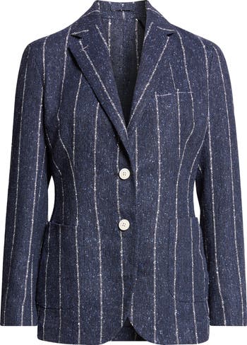 Light pinstripes accentuate the highly slubbed texture of this single-breasted jacket tailored with notched lapels from a denim-look linen-blend twill.