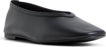 A V-cut topline and squared-off toe create striking dimension on a faux-leather ballet flat cushioned by B.E.D Foam Comfort Technology for lasting wear.