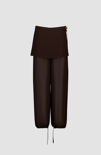 Translucid wide-leg trousers with an integrated overskirt. Designed with adjustable drawstrings and cord stoppers at the hem to taper the silhouette as desired.