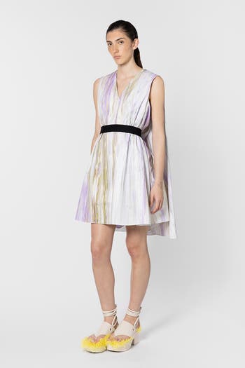 The Elia dress is crafted in printed cotton, featuring an abstract brush stroke print. A fun knee length gown, cinched at the waist and finished with a cape. Model Wears: UK Size 8